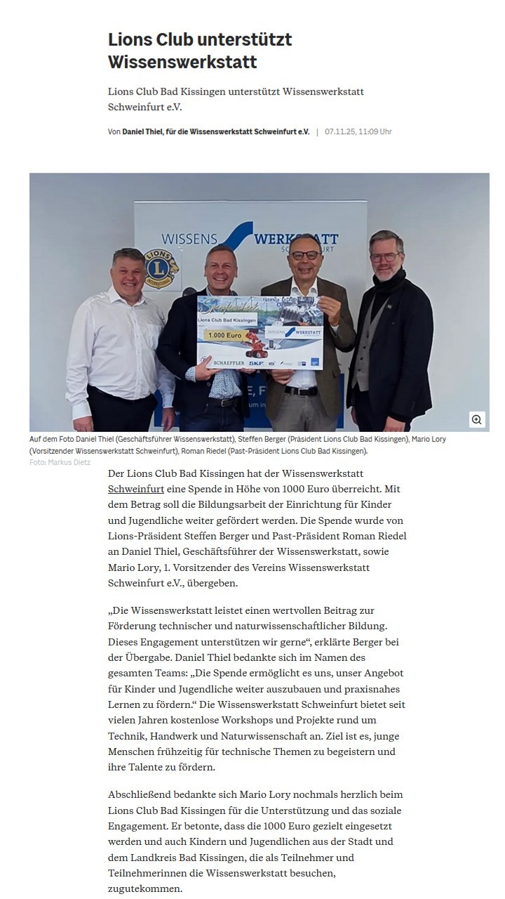 07.11.2025 Lions Club Bad Kissingen unterstützt Wissenswerkstatt